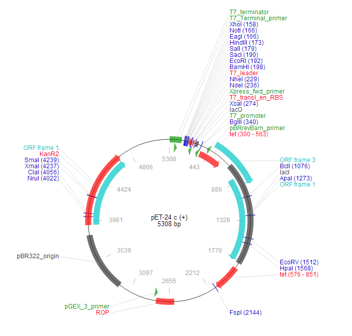 The pET-24a-d(+) vectors carry an N-terminal T7•Tag® sequence plus an optional C-terminal His•Tag® sequence. These vectors differ from pET-21a-d(+) only by their selectable marker (kanamycin vs. ampicillin resistance). Unique sites are shown on the circle map. Note that the sequence is numbered by the pBR322 convention, so the T7 expression region is reversed on the circular map. The cloning/expression region of the coding strand transcribed by T7 RNA polymerase is shown below. The f1 origin is oriented so that infection with helper phage will produce virions containing single-stranded DNA that corresponds to the coding strand. Therefore, singlestranded sequencing should be performed using the T7 terminator primer.