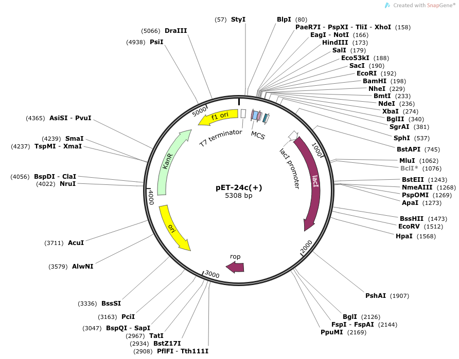 Same as pET21a,b,c,d(+) but kanamycin resistance; a,b,c,d vary by MCS; The f1 origin is oriented so that infection with helper phage will produce virions containing single-stranded DNA that corresponds to the coding strand.