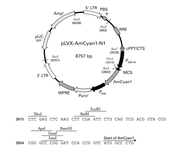 In addition to lentiviral elements, pLVX-AmCyan1-N1 contains a puromycin resistance gene (Puror) under the control of the murine phosphoglycerate kinase (PGK) promoter (PPGK) for the selection of stable transductants. The vector also contains a pUC origin of replication and an E. coli ampicillin resistance gene (Ampr) for propagation and selection in bacteria.